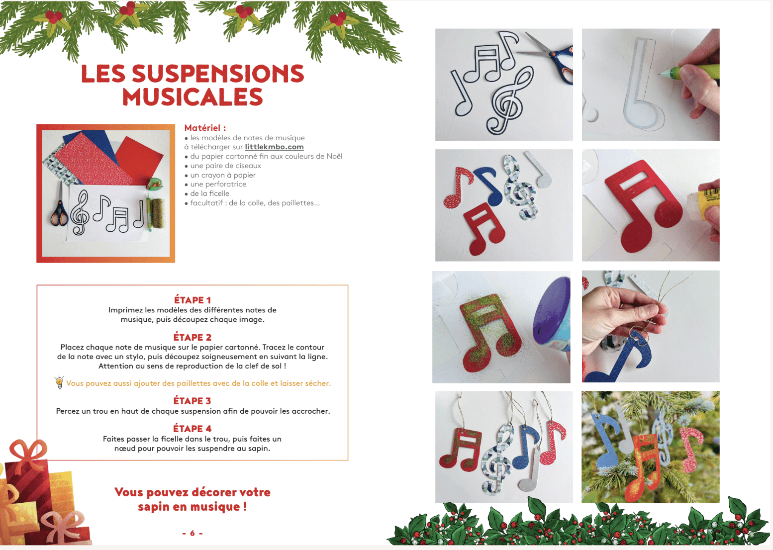Pour prolonger cette expérience sensorielle, cinq activités manuelles et créatives sont proposées en ligne : des bricolages inspirés de la musique et de Noël comme la maracas de fête, la boule à neige ou la guirlande musicale.